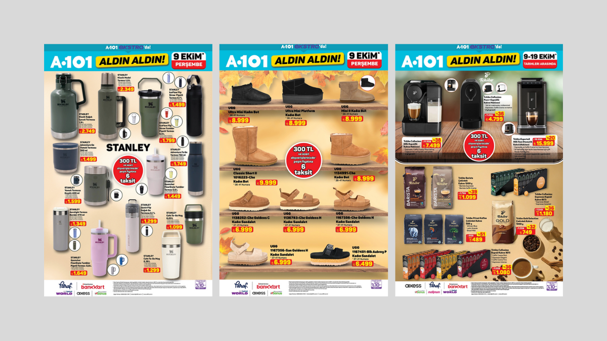 Alışveriş severlerin her hafta perşembe günü heyecanla beklediği A101.com.tr İnternete Özel Aldın Aldın Kataloğu'nun yeni sayısı yayınlandı. A101'de 9 Ekim 2025 tarihinden itibaren satışa sunulan onlarca ürün içinde Stanley termostan küçük ev aletlerine, PUMA ayakkabıdan akıllı televizyona yok yok! Sevilen markaların kaliteli ürünlerine avantajlı fiyatlarla sahip olmanızı sağlayan A101 İnternete Özel Aldın Aldın Kataloğu'nu sizin için bu içeriğimizde bir araya getirdik. İşte detaylar!