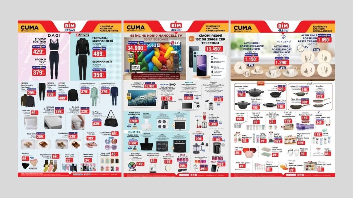 BİM 23 Ocak 2026 katalogda en dikkat çeken ürün kuşkusuz LG 65 inç Nanocell TV olurken 256 GB kapasitesiyle Xiaomi Redmi 15c 5g akıllı telefon da öne çıkıyor. Mutfakta zarafet arayanlar için Porland altın rimli porselen setler ve Hisar Optima tencereler raflarda yerini alırken North Pacific masaj aleti ve Dagi spor kıyafetleri de fitness kategorisinin favorileri arasında. Ayrıca çocukları mutlu edecek sevimli Squishmallows pelüşlar ve hobi severler için Ören Bayan yumaklar, bu haftanın kaçırılmaması gereken fırsatları olarak göze çarpıyor.