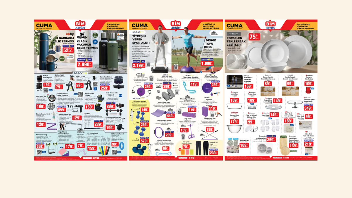 24 Ekim - 30 Ekim tarihinde geçerli BİM aktüel kataloğunda bu hafta her zevke ve ihtiyaca uygun onlarca ürün bir araya geldi. “BİM’de bu hafta neler var?” diye merak edenler için söyleyelim; teknolojiden ev tekstiline, mutfak gereçlerinden spor ekipmanlarına kadar birçok kategorideki üründe avantajlı fiyatlar öne çıkıyor. 55 inç QLED televizyon, Stanley termoslar, Kumtel ısıtıcılar, MaxFit spor ekipmanları, rengârenk terlik modelleri, çocuklara özel oyuncaklar ve şık porselen tabak çeşitleri raflarda yerini alıyor. Bu hafta BİM’e neler gelecek? diye merak edenlerdenseniz işte bugün satışa sunulan ürünler...