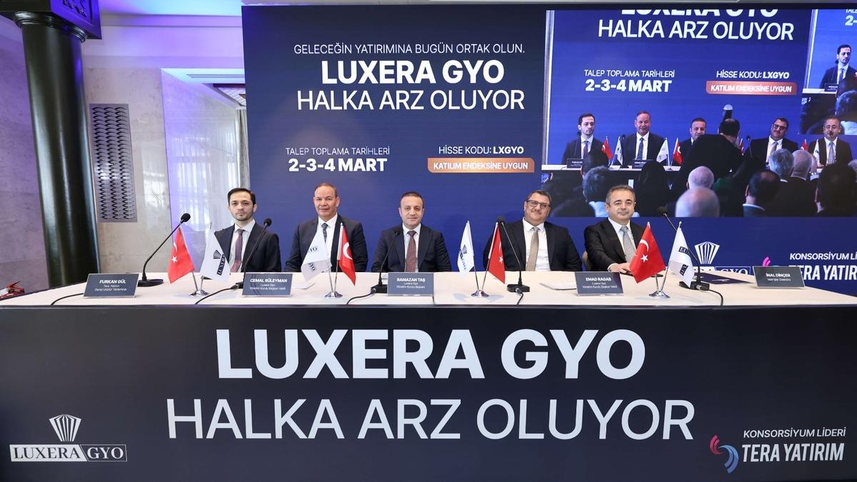 Şirketin 1 milyar 446 milyon TL büyüklüğe sahip halka arzı için talep toplama tarihleri 2-3-4 Mart olarak belirlendi. Sadece konut değil, şehirle bütünleşen yaşam alanları, değer yaratan ticari yapılar ve sosyal merkezler üretme hedefiyle hareket ettiklerini vurgulayan Luxera GYO Yönetim Kurulu Başkanı Ramazan Taş, “Halka arzımızla birlikte şirketimiz için sürdürülebilir bir büyüme sağlarken kendi yatırımlarımızın yanı sıra, yatırımcılarımızın yatırımlarını da güvenle büyütmelerine olanak tanımayı hedefliyoruz” dedi.